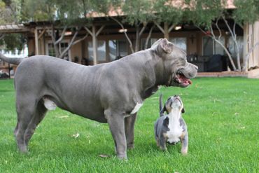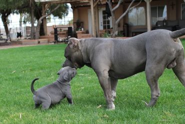 Our puppies are raised at our ranch in our home with the family. We do not keep them in kennels outdoors. They are socialized frequently with our family and visitors. We supply them with a canine enrichment area at 3.5 weeks of age in order to help them develop properly. This area includes plenty of toys, a slide, tubes, a kennel, and more. We work on potty training from an early age, and they learn to use a doggy door. XL and XXL American bullies are very smart and should not have issues with training in your home. We feed our puppies and adult quality dog food and treats. They are also groomed and taught to be handled.